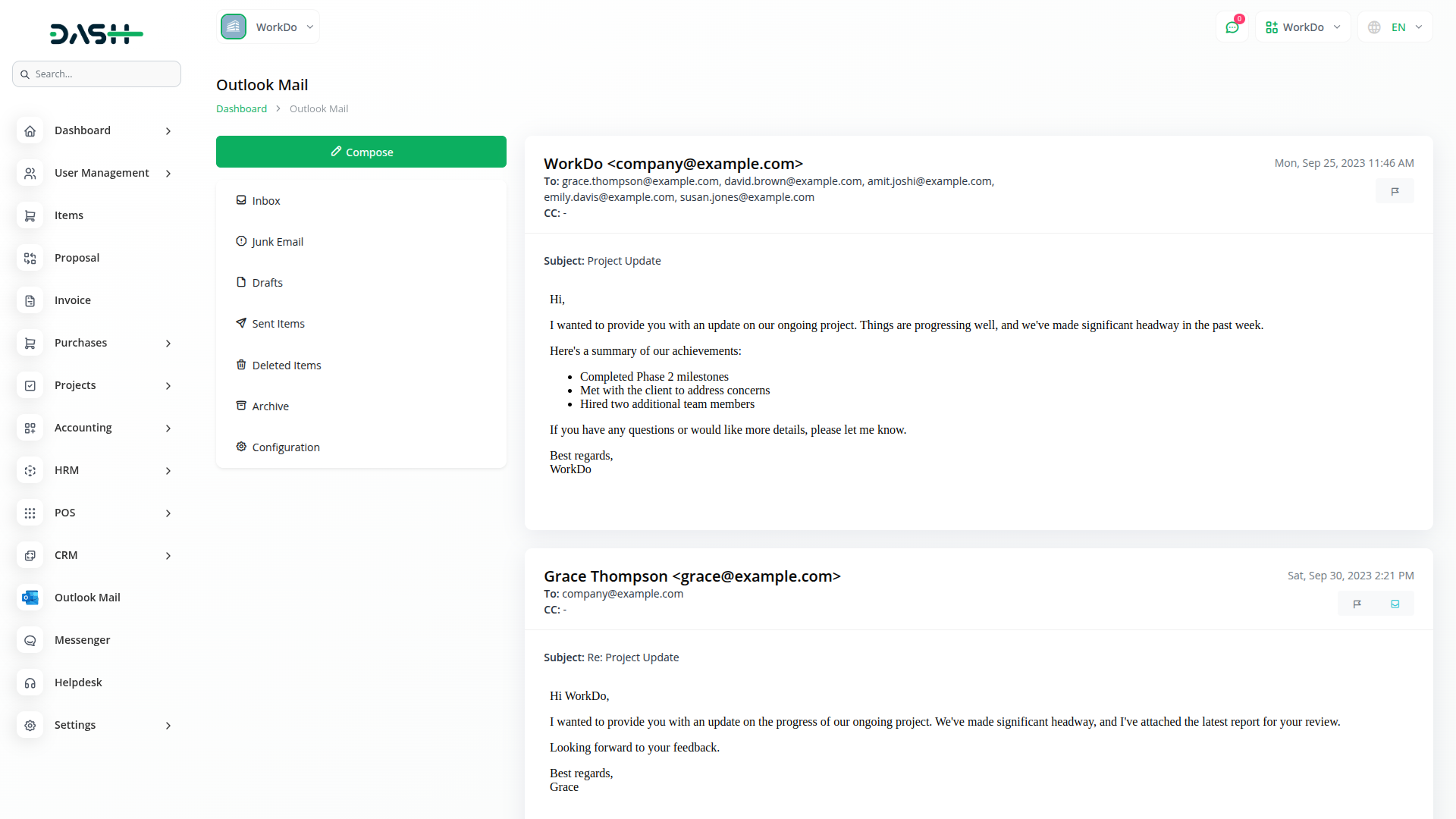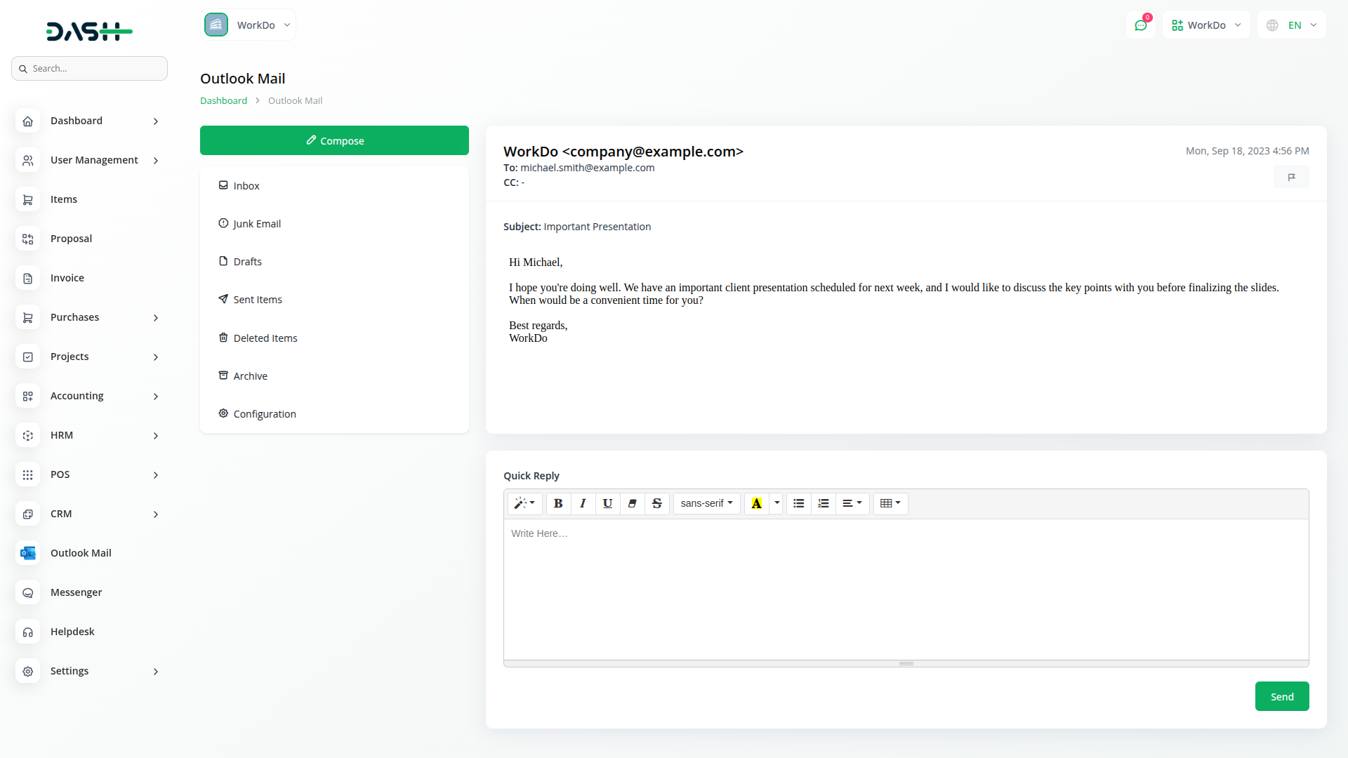 The Outlook Mail Add-On is a robust email management solution that integrates directly with Microsoft Outlook using secure Azure authentication. It offers real-time access to all email folders like Inbox, Sent, Drafts, Junk, and Archive, right from your dashboard. With features like threaded conversations, HTML email composition, quick replies, attachments, and folder organisation, this add-on helps teams manage Outlook emails effortlessly and stay productive without switching platforms.