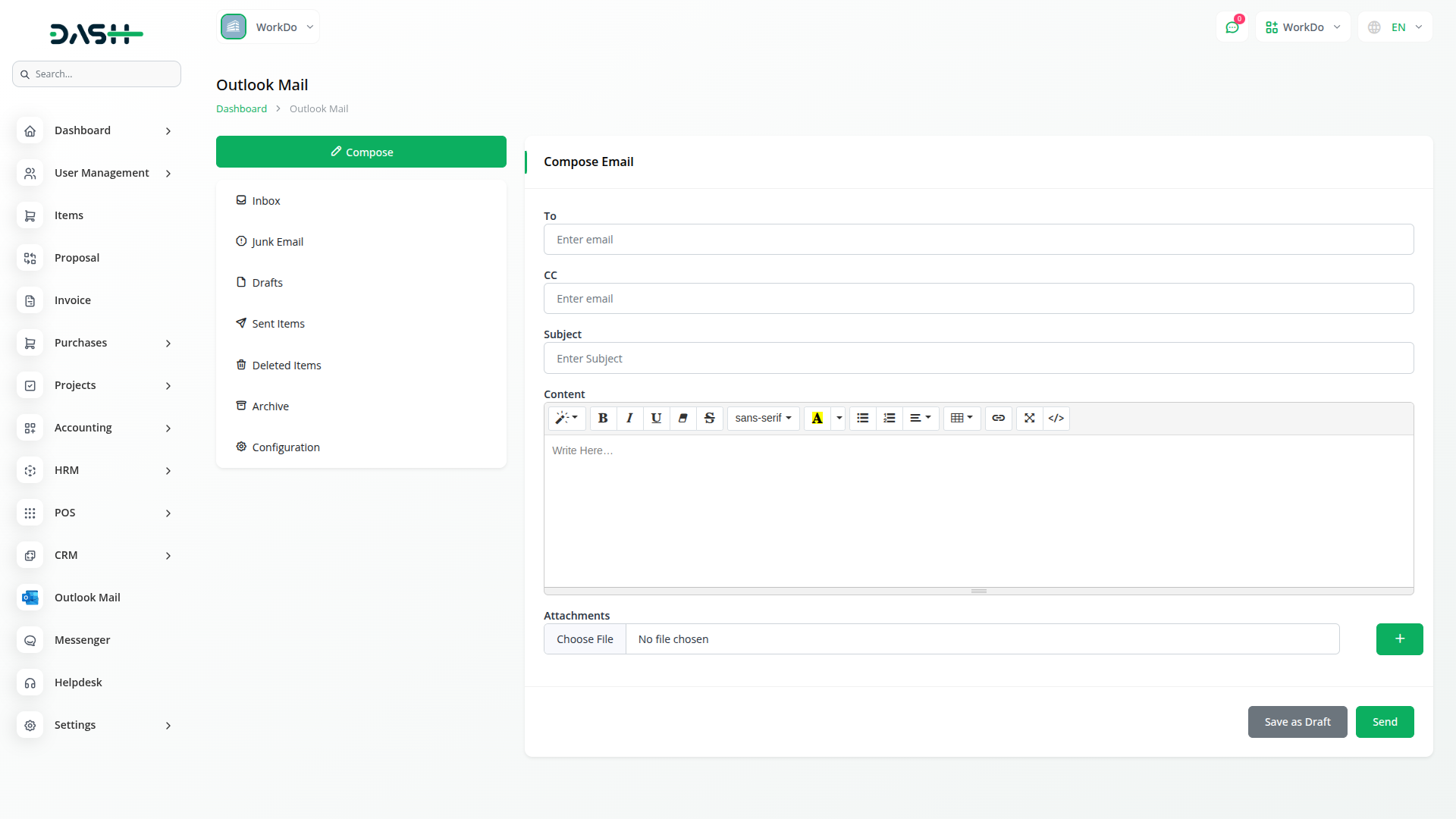 Create rich, formatted emails with full HTML support for professional communication. The compose interface includes fields for To, CC, Subject, and Content with advanced formatting options. Multiple file attachments are supported with easy upload and management features. Handle draft messages with specialised controls, including edit, send, and update functionality. The HTML editor provides formatting tools for creating visually appealing emails that maintain professional standards across different email clients.